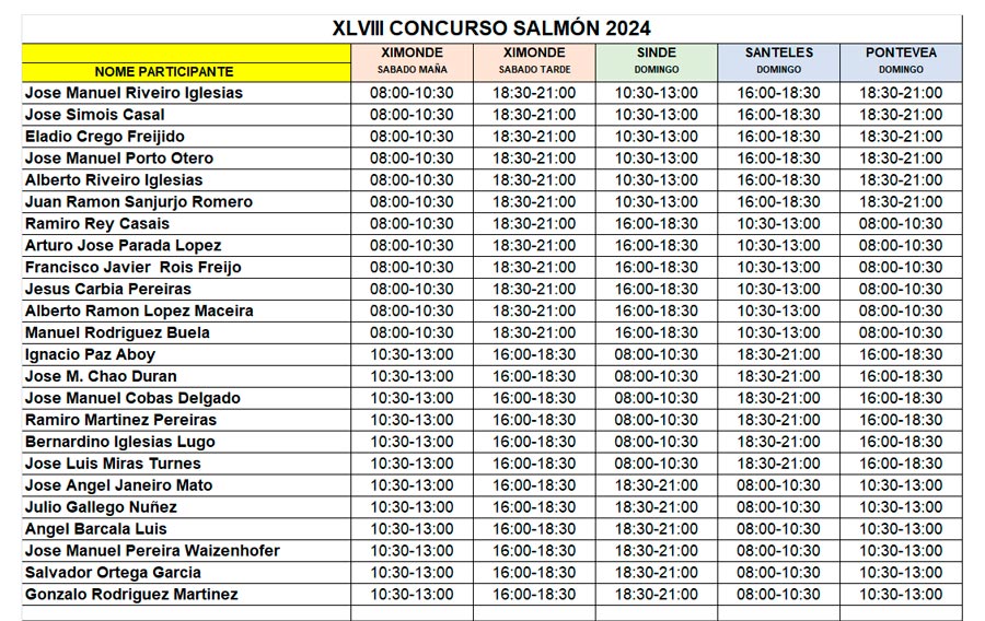 Ayer por la tarde ha sido el sorteo del Concurso internacional del salmón en aguas gallegas que se celebrará el fin de semana del 11 y 12 de mayo. Este año se han presentado 48 cañas que son las que hay disponibles para este concurso por lo que podrán pescar todos los deportistas. Del sorteo realizado ya salieron los horarios que os ponemos a continuación. Este año las tarjetas acreditativas y el desayuno serán en el Bar O Rollo.