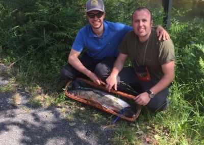 Toño Perandones y Mario posan con el salmón de 5,800 kg y 79 cm a mosca en la zona libre.