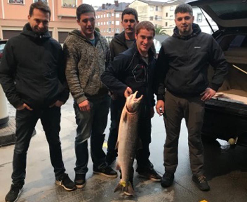 Gonzalo Fernández, posa con sus amigos y el salmón pescado de 5,750 kg en el coto de Covanchón.
