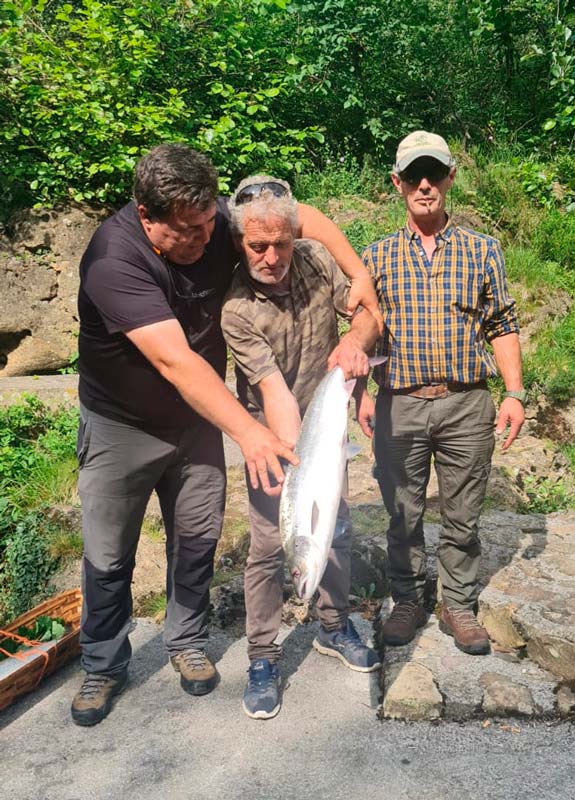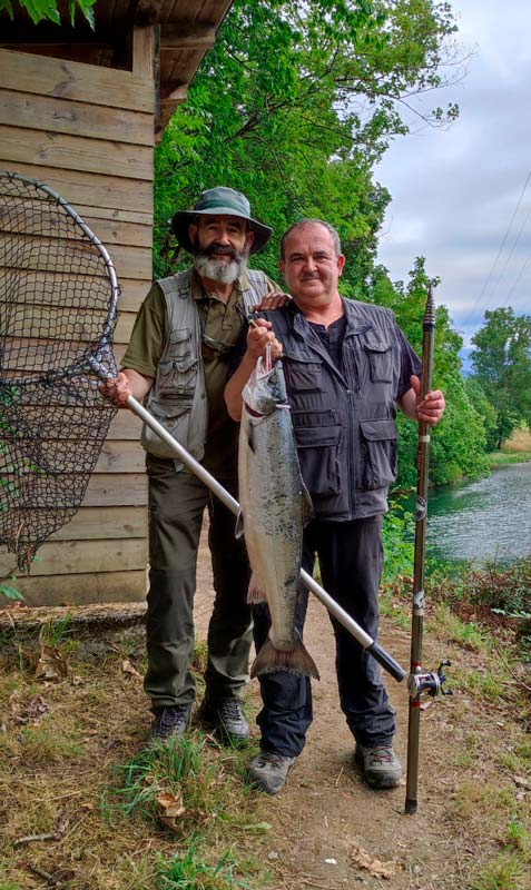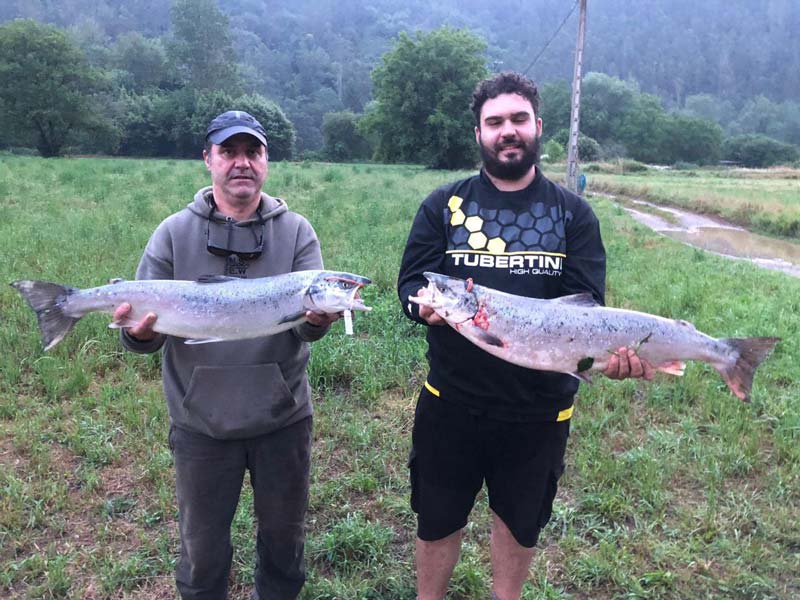 Jesús Ángel Soler y José Miguel Martínez, salmones pescados en Ximonde